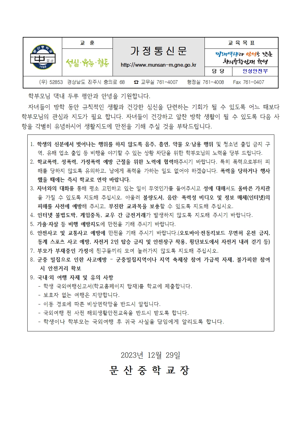 2023. 겨울방학 안전교육 가정통신문 및 안전교육자료
